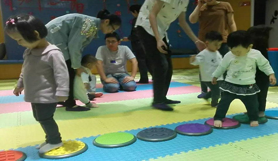 第一个游戏需要家长和宝贝的配合完成哦,小脚踩大脚,需要宝贝踩在家长的脚上,家长需要扶住宝贝走触觉板。